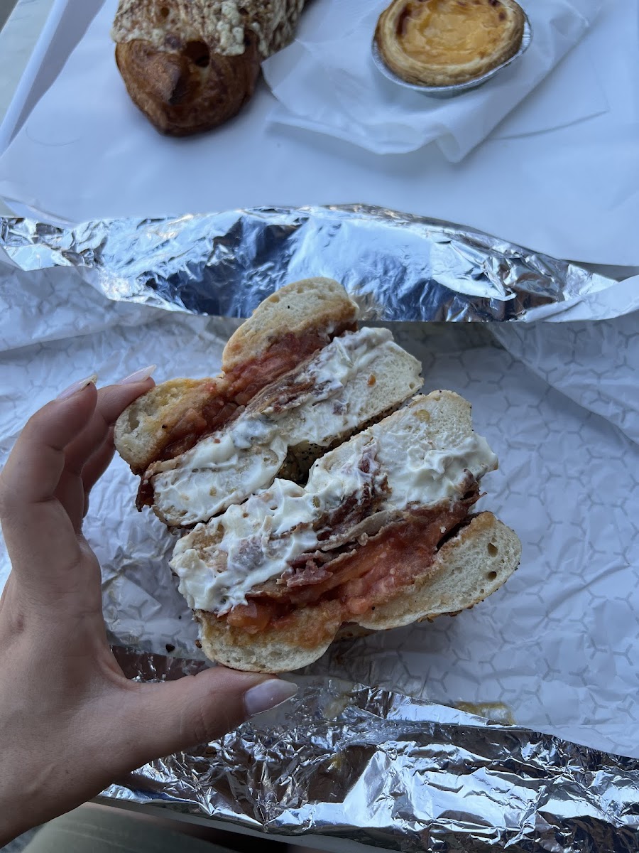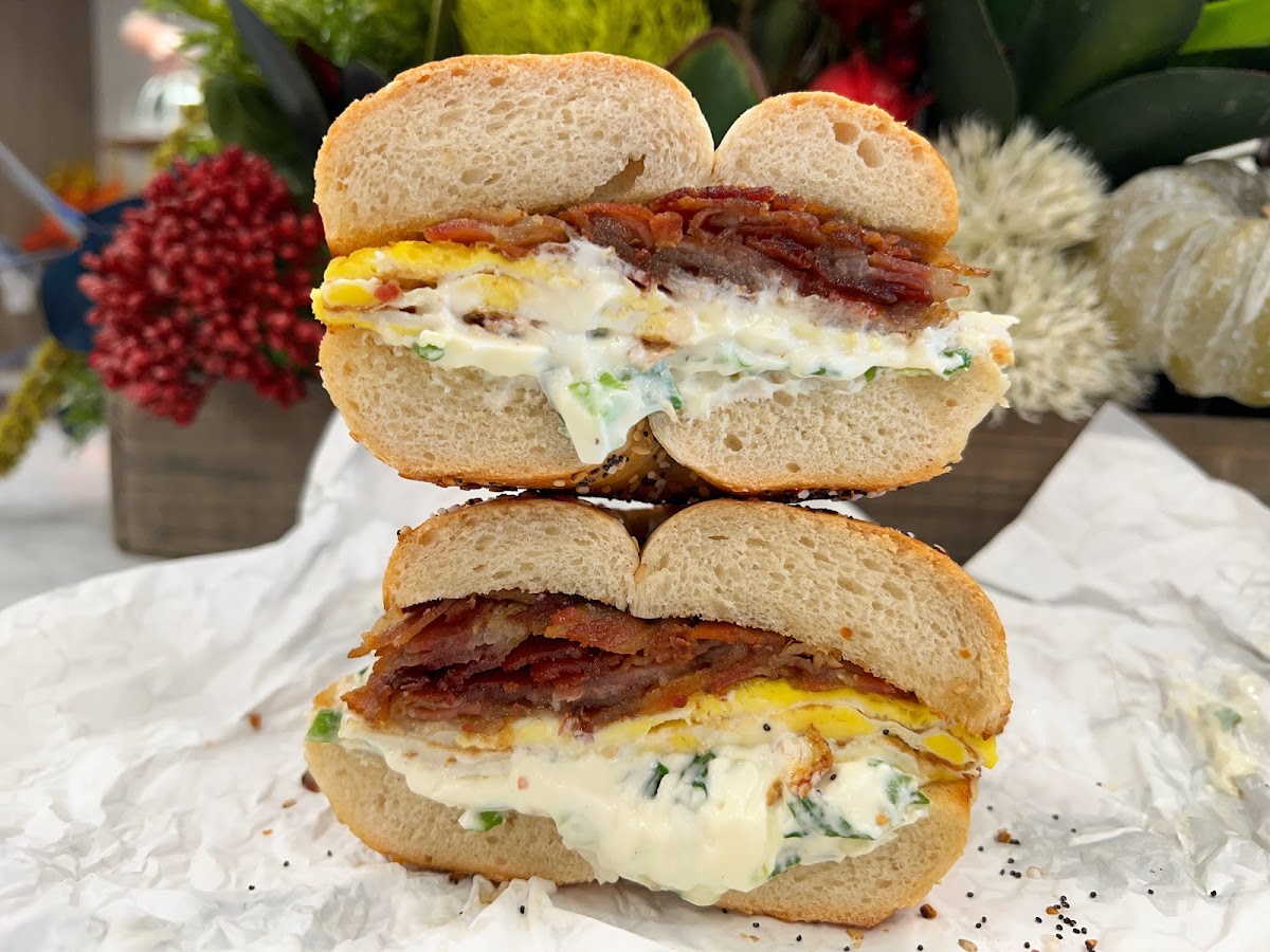Toasted Everything Bagel with Scallion Cream Cheese Bacon Egg and Tomato